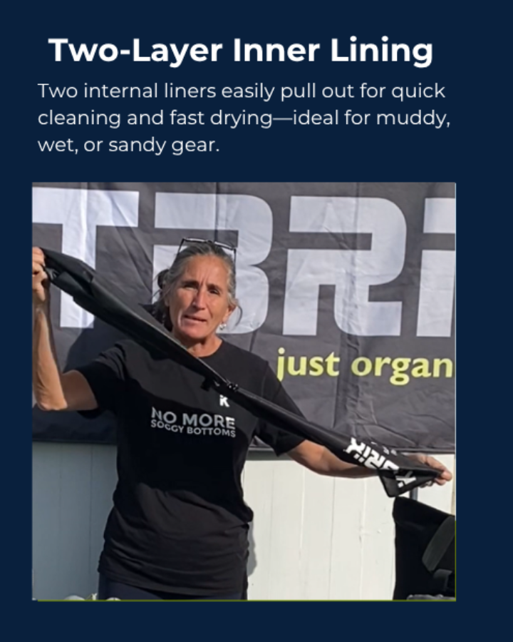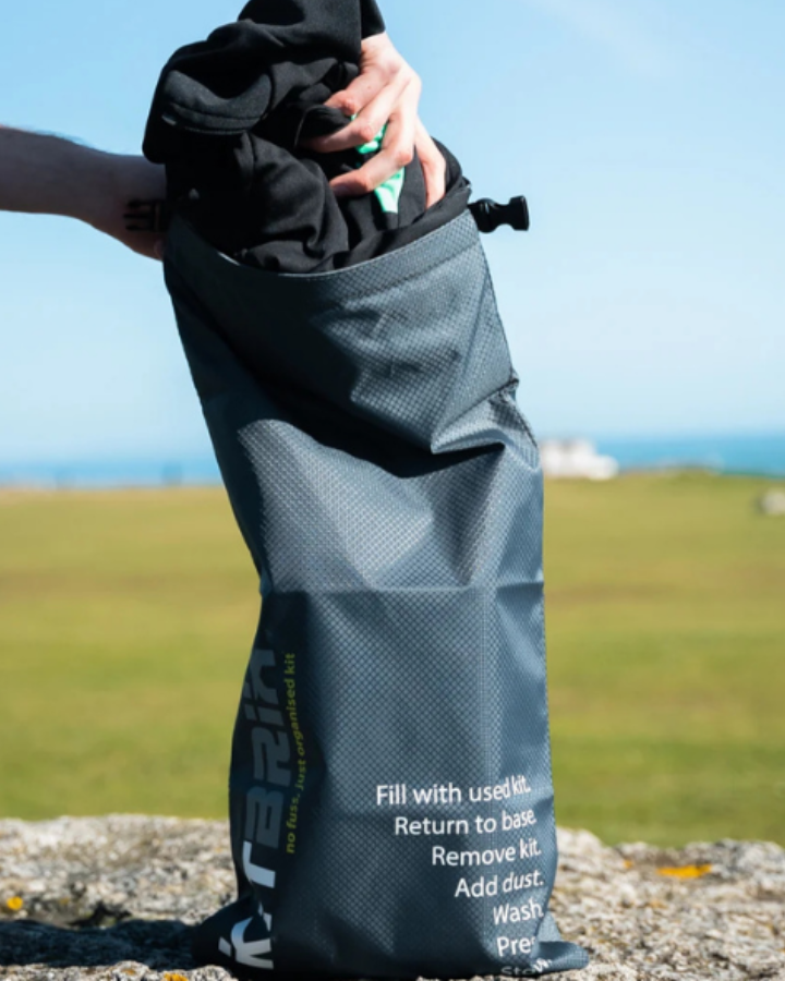 The DobiPak is a 12-liter double-lined ‘dry bag’ with a waterproof inner lining. The outer fabric is a 100% RPET (recycled plastic bottles) ripstop honeycomb design. This bag is large enough to stuff your wetsuit into or put your wet/muddy boots and shoes in so that you don’t have to get any of your other items wet when travelling back after your event or activity.